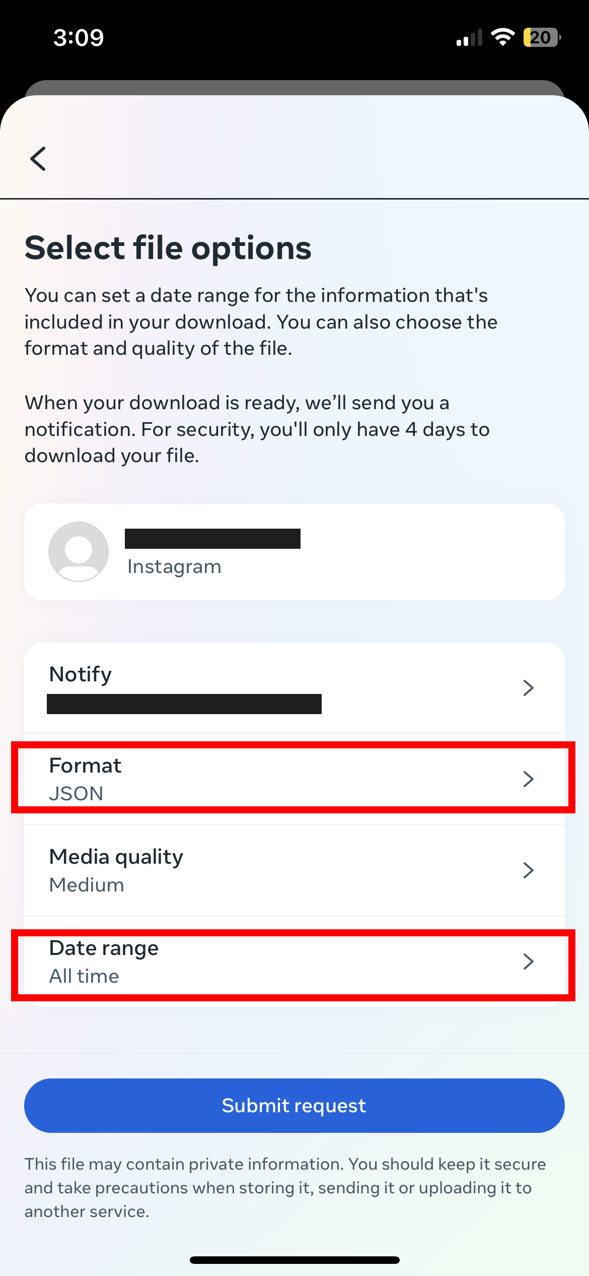 - For Select file options, choose Format: JSON, and Date range: All time. (this is important!)
